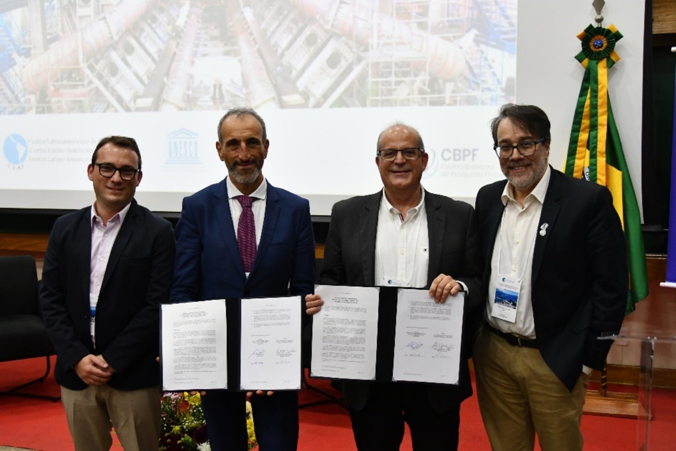Um dos pontos altos do simpósio – encerrando os trabalhos matutinos do encontro – foi a assinatura de memorando de entendimento entre o Centro Nacional de Pesquisa em Energia e Materiais (CNPEM), do Brasil, e o CERN, para paticipação no estudo para o FCC (sigla, em inglês, para Futuro Colisor Circular), acelerador que está sendo planejado pelo laboratório europeu.